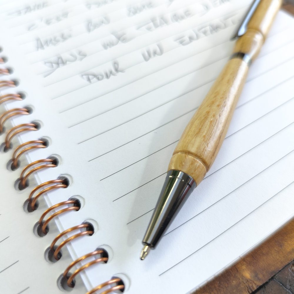 Stylo en bois de fabrication artisanale. Je fabrique sur un tour à bois et je porte beaucoup de soin à la qualité de mes produits. Je fais une forme différente à chacun, ce qui les rend absolument unique.